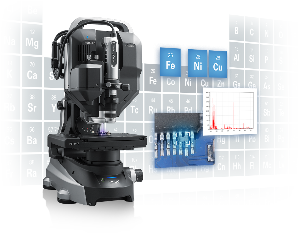 VHX 系列元素分析模組上市,實(shí)現(xiàn)了使用數(shù)位顯微鏡進(jìn)行元素分析。只需將目標(biāo)物放置於載物臺(tái)上,無需破壞目標(biāo)物,也不需要蒸鍍或抽真空。搭載AI-建議,誰都能對(duì)元素分析後的物質(zhì)確認(rèn)作出適當(dāng)判斷。